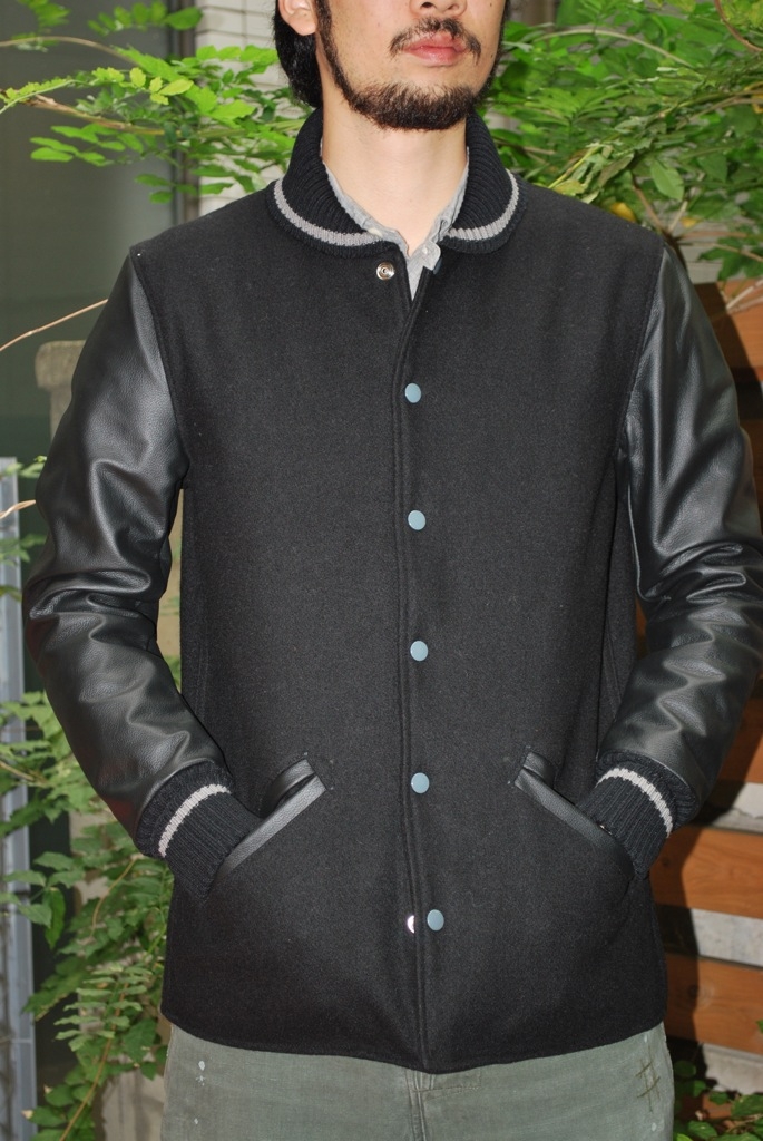 AND CELよりBROADWAY KNITTING MILLS別注のSTADIUM JACKETです。クラシックな形ながら腕まわりはタイトです。着丈は少し長めになっており、裾リブがつかないモデルになっております。ボディはウール、袖は牛革使用とディティールは完璧です。細めのシルエットは今の時代にマッチするのではないでしょうか?